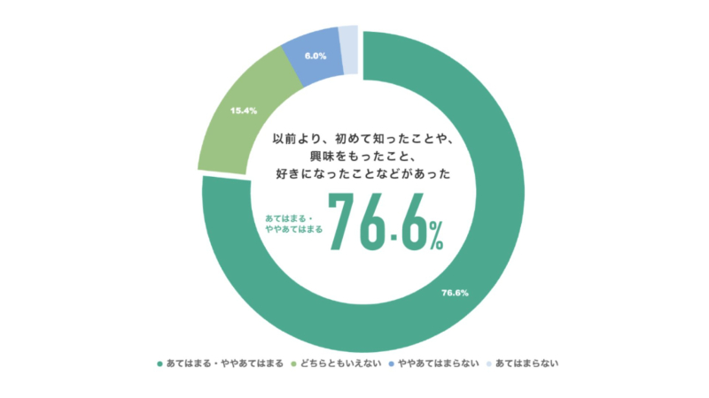 全国のユースセンターを運営したい個人・団体を支援する「ユースセンター起業塾」の調査では、ユースセンターを利用する中高生の約8割が「以前より、初めて知ったことや、興味をもったこと、好きになったことなどがあった」と回答しており、居場所が子どもの成長に影響を与えていることがうかがえます。