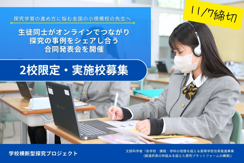 カタリバが運営する「学校横断型探究プロジェクト」は、オンラインで生徒同士が探究活動の成果を発表・交流する「オンライン探究合同発表会」(2026年1〜2月開催想定)について実施を希望する小規模高校2校を募集します。