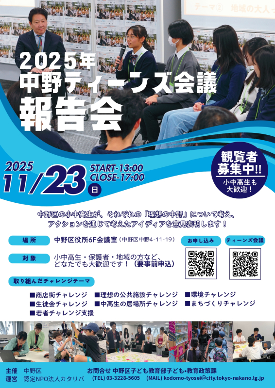 認定特定非営利活動法人カタリバ(本部:東京都中野区、代表理事:今村久美、以下カタリバ)は、東京都中野区から受託し、子ども・若者の声を地域づくりに活かす「中野ティーンズ会議」「中野若者会議」に取り組んできました。この度、区長への意見表明や政策提言を行う場として報告会を開催します。