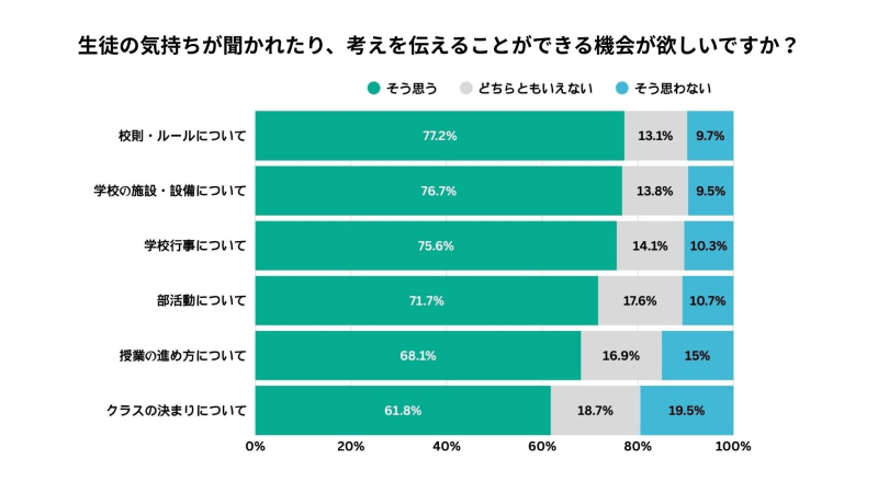 PressRelease/【調査レポート公開】校則以外の場面でも6~8割の生徒が「意見を伝えたい」 -全国約3,000人の中高生に学校での意見表明の実態を調査-
