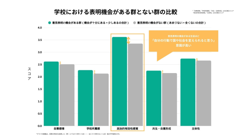 学校における意見表明の機会の有無と、「自尊感情」「学校所属感」「政治的有効性感覚」「共生・合意形成」「主体性」の関係について見てみると、特に学校に関する意見表明の機会がある学校の生徒ほど「自分の行動で、国や社会を変えられると思う」といった政治的有効性感覚が高いという傾向が明らかになりました。