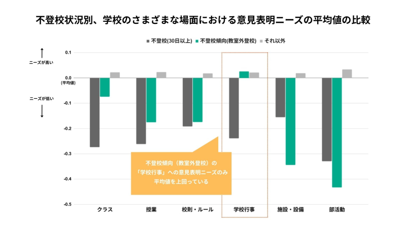 不登校傾向の子の学校の様々な場面における意見表明ニーズ、「学校行事」のみ異なる傾向