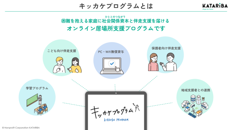経済的に困難を抱える家庭の子どもたちに、パソコンとポケットWi-Fiを無償で貸出し、オンラインでの多様な学びのプログラムの提供と伴走支援を行う「キッカケプログラム」事業。