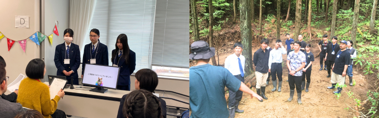 左はマイプロジェクトを発表する高校生の様子/右は奥能登地域の林業現場でのフィールドワークの様子